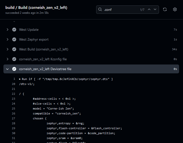 )" step in GitHub Actions) logs what devicetree files were found and used in the build: